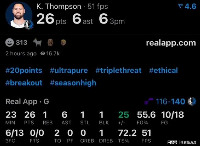 湯普森這場創(chuàng)造里程碑的比賽,那可真是精彩絕倫!在獨行俠144 - 122大勝爵士的這場“大戰(zhàn)”里,投籃18次,有10次穩(wěn)穩(wěn)命中,三分球更是厲害,13次出手,6次精準(zhǔn)入網(wǎng),輕輕松松就砍下26分,還順便送出6次助攻,把隊友們也喂得飽飽的,厲害吧!
