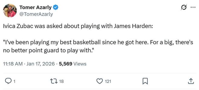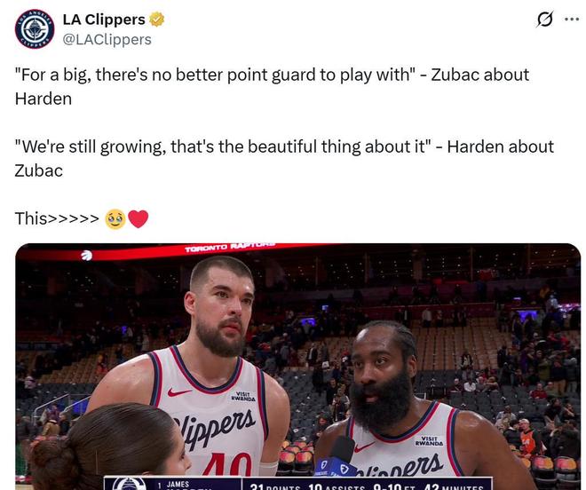 賽后祖巴茨也點名感謝哈登:“自從哈登加盟以來,他幫助我打出最好的籃球,對于大個球員來說,沒有比他更好的控衛(wèi)了?!?/p>