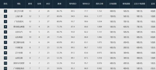 本賽季至今,折兵損將的遼寧隊(duì)僅取得8勝7負(fù)排名聯(lián)盟第九,前四位置分別是衛(wèi)冕冠軍廣廈隊(duì)13-2、上海隊(duì)12-3、廣東隊(duì)12-3和青島隊(duì)11-4。