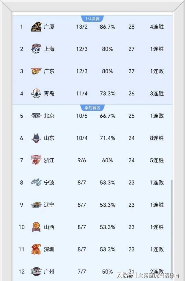 ②、青島隊11勝4負(fù)反超北京隊的10勝5負(fù),排名第4;