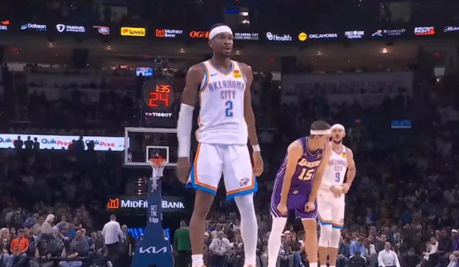次節(jié)回來,小米切爾反擊中果斷出手三分命中,還造成斯馬特打手犯規(guī),吉昂點起艾頓,利用節(jié)奏后仰中距離也投進,小米切爾倒地送出秒傳,助攻哈滕完成空接灌框,雷霆已經(jīng)領(lǐng)先到19分。卡魯索極限搶斷里夫斯,反擊追身三分彈進籃筐,亞歷山大一步變向過掉八村壘,接上下步挑籃得手,分差已經(jīng)拉開到25分。斯馬特干拔三分終于命中,投進湖人第二節(jié)的首個運動戰(zhàn)進球,目前全隊10中1,里夫斯單吊內(nèi)線又被搶斷,送出全隊第11記失誤,喬轉(zhuǎn)換三分再投中,半場戰(zhàn)罷,雷霆70-38領(lǐng)先到湖人32分。