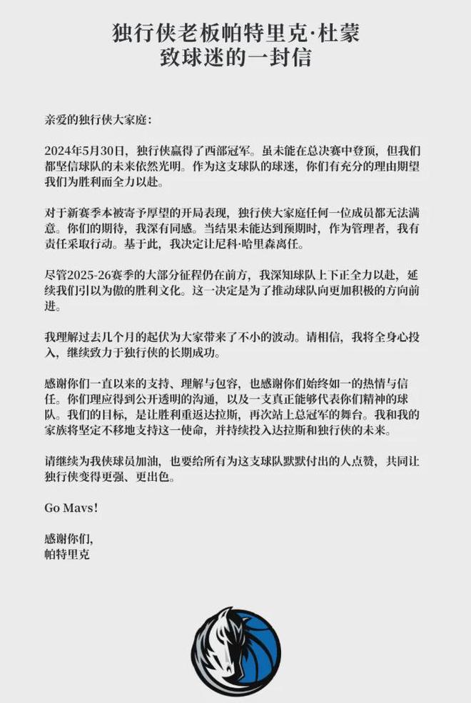 小牛這邊,杜蒙特給球迷寫了一封信,表達歉意,但其實沒什么作用。