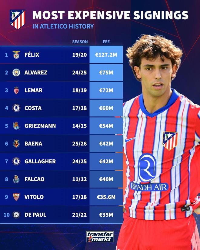 據(jù)《世界體育報》此前報道,Apollo Sports Capital將以約13億歐元的價格收購馬德里競技俱樂部55%的股份,成為馬競的大股東。早些時候,德國轉(zhuǎn)會市場列出了馬競隊(duì)史最貴引援榜單,菲利克斯以1.272億歐元居首。