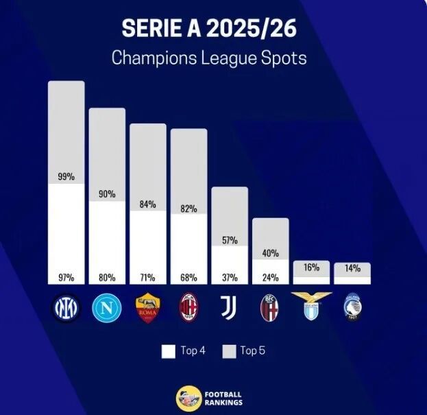根據(jù)Footballrankings的預(yù)測,意甲有28%的概率下賽季五隊(duì)征戰(zhàn)歐冠。