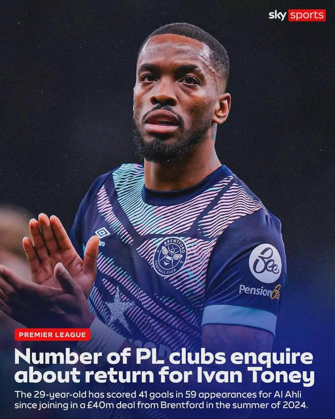 天空體育記者LT消息,很多英超俱樂部正在詢問把伊萬-托尼帶回英格蘭的可能性,自去年夏天從布倫特福德以4000萬英鎊的價格加盟吉達(dá)國民以來,這名29歲的前鋒已經(jīng)在59場比賽中打進(jìn)41球。